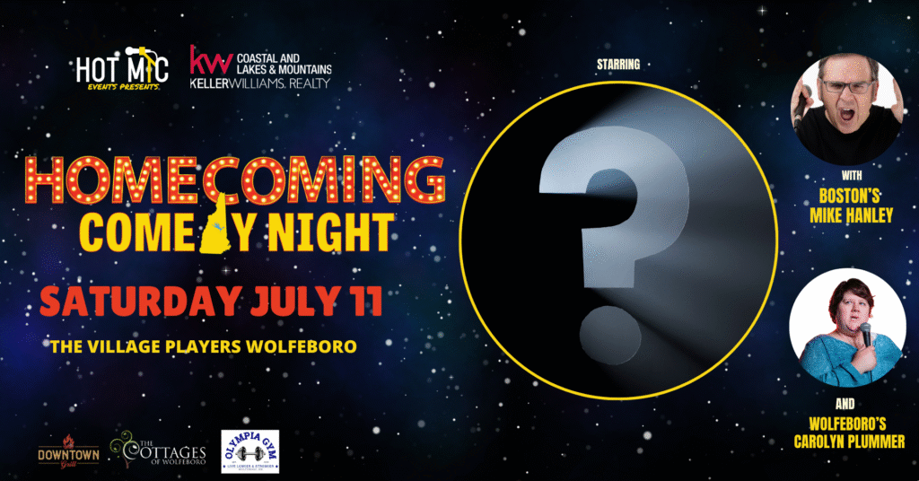 HOT MIC EVENTS Presents: A Lake Winnipesaukee tradition. The Winnipesaukee Homecoming Comedy Night @ The Village Players in Wolfeboro, NH. Saturday night July 11th 2026. Followed by an elevated after party in Wolfeboro’s Downtown Grill. Presented by: Keller Williams Coastal and Lakes & Mountains Realty! Sponsored by: The Cottages of Wolfeboro (www.CottagesNH.com), Olympia Gym & Fitness (www.olympiagym603.com )